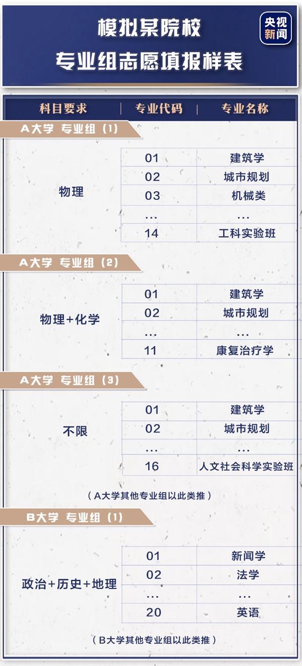 學(xué)生在填報(bào)志愿表時(shí),按照“院校專業(yè)組+專業(yè)”的方式填寫(xiě),只要選考科目符合要求,學(xué)生就可以在志愿表第1行填寫(xiě)A大學(xué)專業(yè)組(1)+該專業(yè)組后面的幾個(gè)專業(yè),第2行填寫(xiě)A大學(xué)專業(yè)組(2)+該專業(yè)組后面的幾個(gè)專業(yè),以此類推。