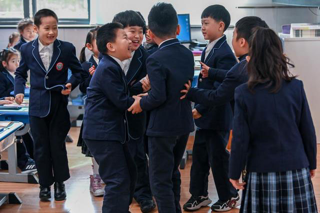 2021年2月22日,上海開學(xué)首日,很久不見的盧灣一中心小學(xué)的同學(xué)們互相擁抱,開心地聊天。澎湃新聞記者 朱偉輝 圖