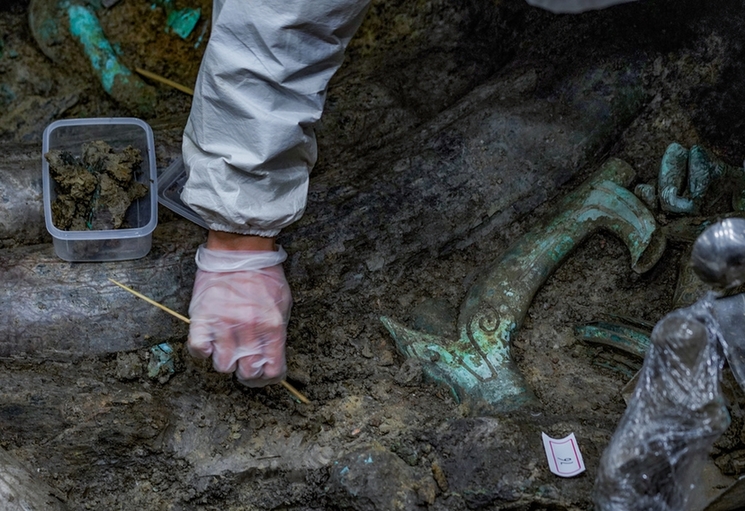 一鍬一鏟,叩問大地緘默。一擔一籃,剝除歷史塵封。三星堆遺址4號坑發(fā)掘人員許丹陽,每天的大部分工作就是拿著各種小刷子小鏟子刨土挖土。許丹陽也是一位90后,生于95年的他,去年從北京大學考古文博學院研究生畢業(yè)后,進入到四川省文物考古研究院工作。此次“入坑”三星堆,已經(jīng)是他的第二次。在2018年時,正在攻讀研究生的許丹陽就已經(jīng)來過三星堆進行學術(shù)研究,而這次剛參加工作就加入了三星堆祭祀?yún)^(qū)新一輪考古的隊伍,負責最先啟動的4號坑發(fā)掘,他感覺正逢其時。