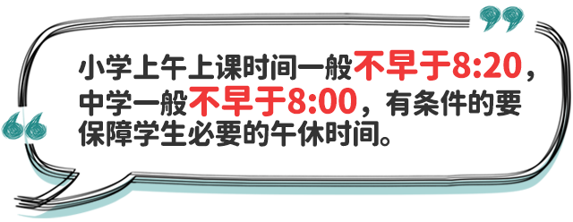三、統(tǒng)籌安排學(xué)校作息時(shí)間。省級(jí)教育行政部門(mén)要從保證學(xué)生充足睡眠需要出發(fā),結(jié)合實(shí)際情況合理確定中小學(xué)作息時(shí)間。小學(xué)上午上課時(shí)間一般不早于8:20,中學(xué)一般不早于8:00;學(xué)校不得要求學(xué)生提前到校參加統(tǒng)一的教育教學(xué)活動(dòng),對(duì)于個(gè)別因家庭特殊情況提前到校學(xué)生,學(xué)校應(yīng)提前開(kāi)門(mén)、妥善安置;合理安排課間休息和下午上課時(shí)間,有條件的地方和學(xué)校應(yīng)保障學(xué)生必要的午休時(shí)間;寄宿制學(xué)校要合理安排作息時(shí)間,確保學(xué)生達(dá)到規(guī)定睡眠時(shí)間要求。