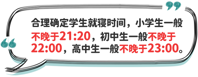 二、明確學(xué)生睡眠時(shí)間要求。根據(jù)不同年齡段學(xué)生身心發(fā)展特點(diǎn),小學(xué)生每天睡眠時(shí)間應(yīng)達(dá)到10小時(shí),初中生應(yīng)達(dá)到9小時(shí),高中生應(yīng)達(dá)到8小時(shí)。學(xué)校、家庭及有關(guān)方面應(yīng)共同努力,確保中小學(xué)生充足睡眠時(shí)間。