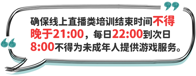 五、合理安排學(xué)生就寢時(shí)間。中小學(xué)校要指導(dǎo)家長(zhǎng)和學(xué)生,制訂學(xué)生作息時(shí)間表,在保證學(xué)生睡眠時(shí)間要求前提下,結(jié)合學(xué)生個(gè)體睡眠狀況、午休時(shí)間等實(shí)際,合理確定學(xué)生晚上就寢時(shí)間,促進(jìn)學(xué)生自主管理、規(guī)律作息、按時(shí)就寢。小學(xué)生就寢時(shí)間一般不晚于21:20;初中生一般不晚于22:00;高中生一般不晚于23:00。個(gè)別學(xué)生經(jīng)努力到就寢時(shí)間仍未完成作業(yè)的,家長(zhǎng)應(yīng)督促按時(shí)就寢不熬夜,確保充足睡眠;教師應(yīng)有針對(duì)性幫助學(xué)生分析原因,加強(qiáng)學(xué)業(yè)輔導(dǎo),提出改進(jìn)策略,如有必要可調(diào)整作業(yè)內(nèi)容和作業(yè)量。各地教育部門(mén)要會(huì)同相關(guān)部門(mén)切實(shí)加強(qiáng)對(duì)轄區(qū)內(nèi)注冊(cè)登記或備案的線(xiàn)上培訓(xùn)網(wǎng)課平臺(tái)、網(wǎng)絡(luò)游戲的規(guī)范管理,采取技術(shù)手段進(jìn)行監(jiān)管,確保線(xiàn)上直播類(lèi)培訓(xùn)活動(dòng)結(jié)束時(shí)間不得晚于21:00,每日22:00到次日8:00不得為未成年人提供游戲服務(wù)。