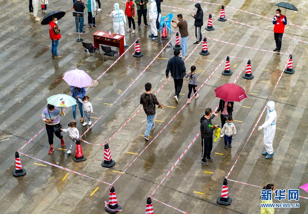 4月6日,在瑞麗市目瑙社區(qū)一核酸檢測點,當?shù)鼐用裢ㄟ^設置的通道排隊采樣。新華社記者 陳欣波 攝