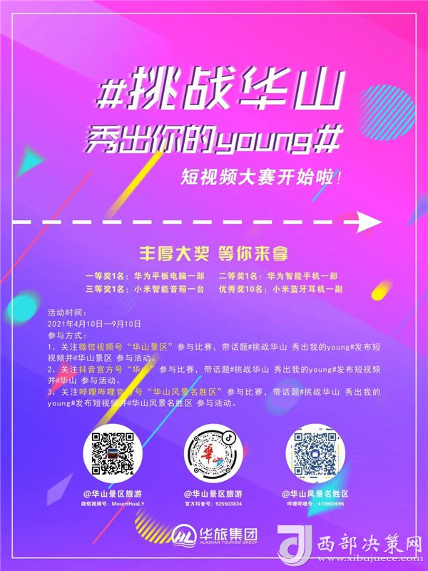 朝氣蓬勃的青年學(xué)生擁有敏銳的感受力和發(fā)現(xiàn)美的能力。為了進(jìn)一步挖掘華山獨(dú)特自然風(fēng)光及厚重的文化內(nèi)涵,激發(fā)大學(xué)生群體的創(chuàng)作才能,華旅集團(tuán)營銷中心特向大學(xué)生推出“挑戰(zhàn)華山 秀出你的young”短視頻大賽,在比賽之余,可圍繞華山自然風(fēng)光、人文歷史、傳說典故、道教文化等進(jìn)行創(chuàng)作,以年輕人的視角展示華山獨(dú)特之美,活動(dòng)自4月10日起,在微信視頻號(華山景區(qū))、抖音APP(華山)、嗶哩嗶哩(華山風(fēng)景名勝區(qū))等平臺正式啟動(dòng)。