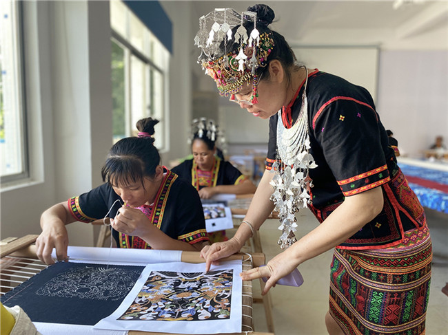 在技藝恢復(fù)的過程中,郭凱的團(tuán)隊也有意外的收獲。通過對三聯(lián)幅、五聯(lián)幅龍被的復(fù)制,恢復(fù)傳統(tǒng)龍被織造技藝,對黎錦傳統(tǒng)技藝的傳承與發(fā)展具有重要意義;通過對龍被的原材料使用和織造技藝(包括紡染織繡各項技藝)過程編輯形成圖文資料,拍攝形成影像資料,為龍被技藝的保護(hù)、傳承與發(fā)展留下了寶貴的資料和傳播素材;通過開辦龍被刺繡技能培訓(xùn)班,培養(yǎng)了一批刺繡人才,使越來越多的人群能夠掌握傳統(tǒng)特色一技之長,繼而產(chǎn)生富有民族特色的經(jīng)濟(jì)效益和社會效益,更大程度地傳承民族技藝,并將其發(fā)揚光大。