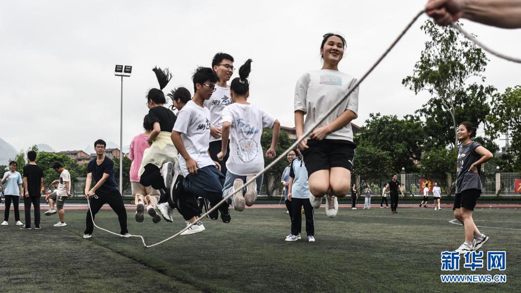 6月1日,在廣西河池市都安瑤族自治縣高級中學(xué)操場上,高三年級學(xué)生在開展跳繩比賽。新華社記者 張愛林 攝