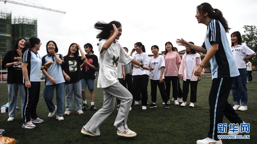 6月1日,在廣西河池市都安瑤族自治縣高級中學(xué)操場上,高三年級一位班主任帶領(lǐng)學(xué)生開展游戲活動(dòng)。新華社記者 張愛林 攝
