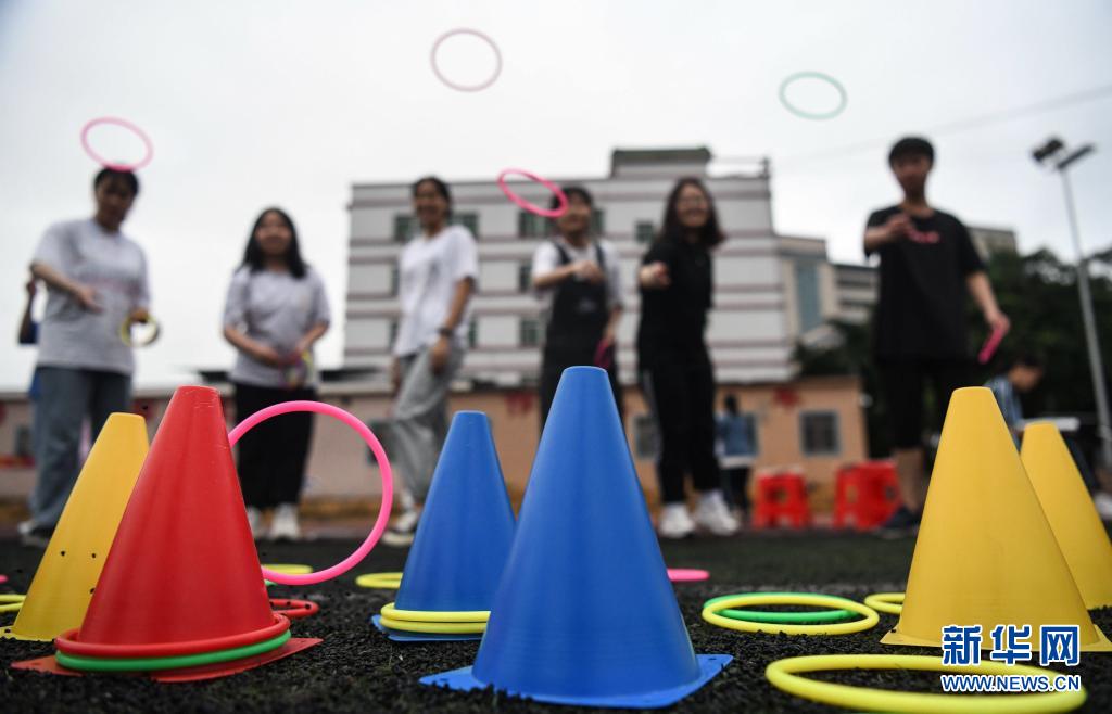 6月1日,廣西河池市都安瑤族自治縣高級中學(xué)高三學(xué)生在操場上玩套圈圈游戲。新華社記者 張愛林 攝