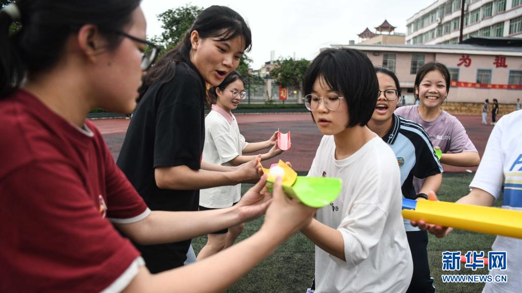 6月1日,在廣西河池市都安瑤族自治縣高級中學(xué)操場上,高三年級女生在玩乒乓球接龍游戲。新華社記者 張愛林 攝