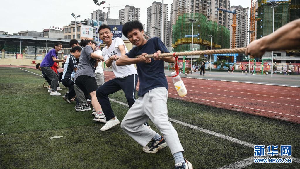 6月1日,在廣西河池市都安瑤族自治縣高級中學(xué)操場上,高三年級學(xué)生在開展拔河比賽。新華社記者 張愛林 攝