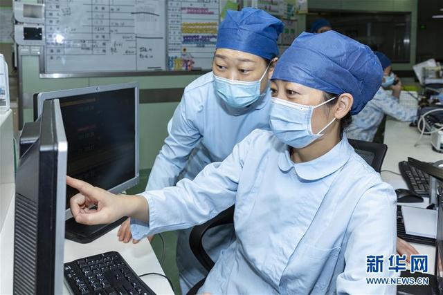 海軍軍醫(yī)大學(xué)第二附屬醫(yī)院急診、重癥醫(yī)學(xué)科護士長陳靜(右)通過監(jiān)控查看病人情況(8月5日攝)。新華社發(fā)(汪輝 攝)