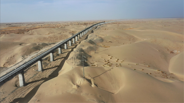 和若鐵路為國家重點(diǎn)鐵路建設(shè)項(xiàng)目,線路全長(zhǎng)825.476公里,2018年12月開工建設(shè),連通南疆和田地區(qū)和田市與巴音郭楞蒙古自治州若羌縣。完成鋪軌的和若鐵路與現(xiàn)有格庫鐵路、喀和鐵路、南疆鐵路連通,環(huán)繞塔克拉瑪干沙漠一周,構(gòu)成世界首條環(huán)沙漠鐵路線。