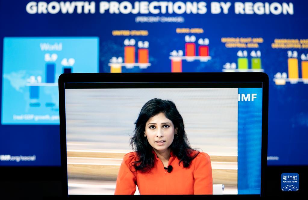 10月12日,國際貨幣基金組織(IMF)首席經(jīng)濟(jì)學(xué)家吉塔·戈皮納特在美國華盛頓出席線上視頻新聞發(fā)布會。新華社記者 劉杰 攝