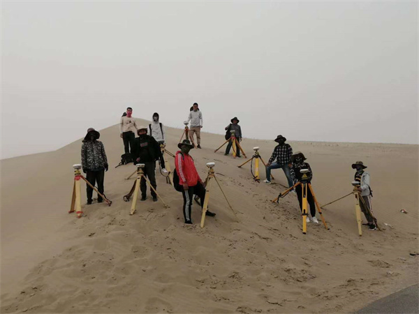 后來,唐飛帶領(lǐng)團(tuán)隊(duì)又前往新疆若羌,為中鐵一局三公司和若鐵路項(xiàng)目進(jìn)行前期控制網(wǎng)復(fù)測(cè)。項(xiàng)目線路長(zhǎng)、地廣人稀,且地處塔克拉瑪干沙漠邊緣。為了節(jié)省時(shí)間,每天早上他和隊(duì)員背著馕、咸菜、礦泉水出發(fā),在沙漠戈壁一測(cè)就是十二個(gè)小時(shí),晚上八九點(diǎn)左右才能回去吃口熱飯。有一次,他們?cè)诠さ厣蠝y(cè)量時(shí),突遇沙塵暴,他和三個(gè)組員趕快收拾儀器,裝進(jìn)儀器箱,四個(gè)人圍在一起,等著沙塵暴過去。