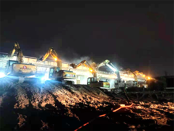 在施工現(xiàn)場,隨著指揮員的一聲令下,50多臺設備齊裝上陣,轟隆作業(yè)。由于該兩座橋同時上跨京滬高速公路,現(xiàn)場作業(yè)空間有限。為確保此次拆橋任務安全順利進行,同時降低施工影響,京滬高速公路HA4標項目部對施工現(xiàn)場進行詳細調查,多次組織召開專家施工方案評審會,反復論證,細化橋梁拆除方案,精準把控施工計劃;項目部領導班子和管理人員,全稱盯控,確保拆除工作萬無一失。