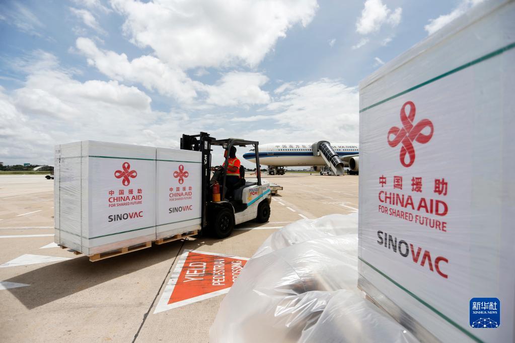 工作人員在柬埔寨金邊國際機(jī)場(chǎng)運(yùn)輸中國政府援助柬埔寨的科興新冠疫苗(2021年10月14日攝)。新華社發(fā)(批隆攝)