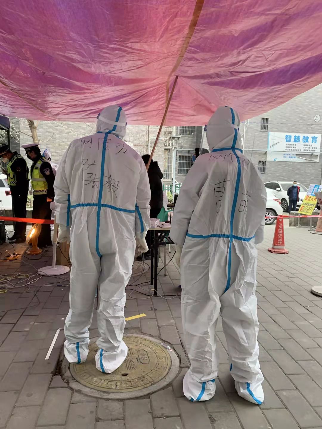 就在隔壁美美佳園小區(qū),張毅、曹萌、胡迪、劉春艷、胡振東、徐晨楊等人也早早鉆進(jìn)了防護(hù)服,從學(xué)習(xí)到上崗、從開(kāi)始到投入,絲毫沒(méi)有停歇,午餐時(shí)間成了唯一交流的機(jī)會(huì),在微信群里工作的照片就像是默契的鏡子:“已看不清是誰(shuí)的臉,卻能彼此知道你是誰(shuí)。”