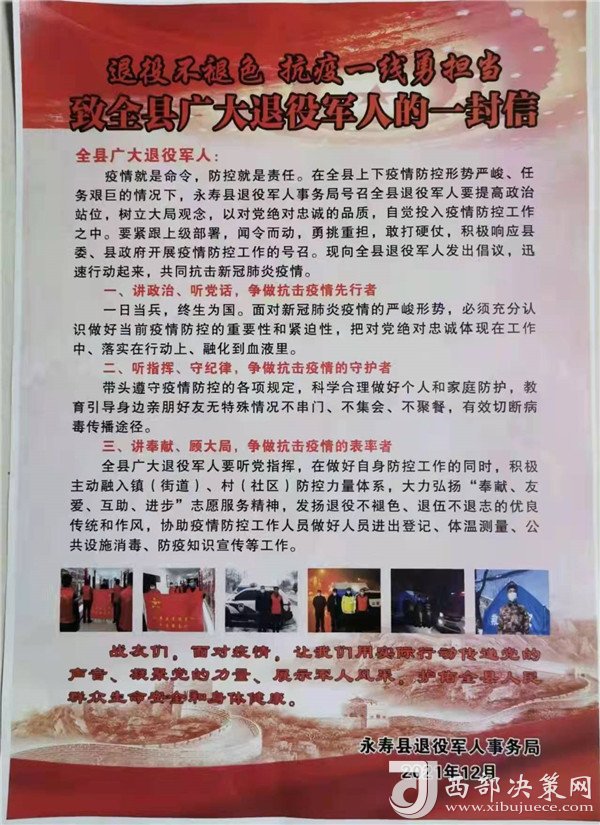 西部決策網(wǎng)訊(王江) “我志愿加入永壽縣退役軍人志愿者服務(wù)隊(duì),不記報(bào)酬,不論生死,聽從黨和政府安排,絕不退后!退役不褪色、退伍不落伍、轉(zhuǎn)業(yè)不轉(zhuǎn)志”,退役軍人依然是人民的子弟兵,心中時刻裝著祖國和人民,在新型肺炎疫情來襲之際,退役軍人紛紛請戰(zhàn)。