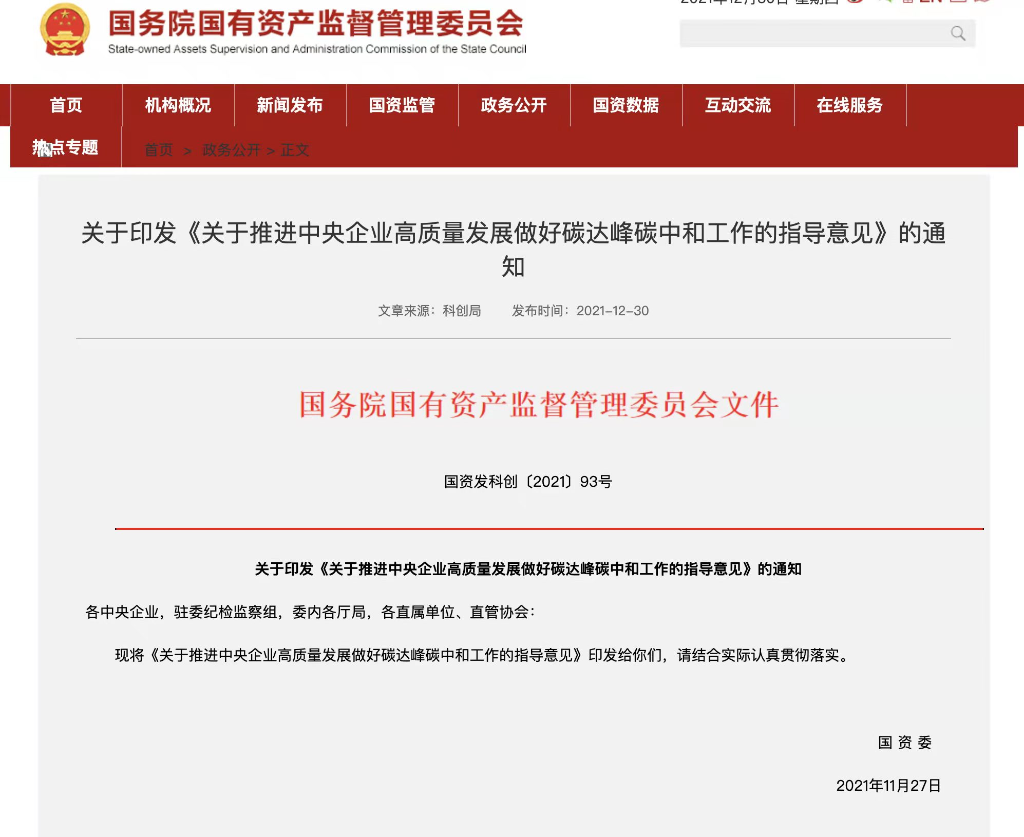 國(guó)務(wù)院國(guó)資委30日對(duì)外發(fā)布《關(guān)于推進(jìn)中央企業(yè)高質(zhì)量發(fā)展做好碳達(dá)峰碳中和工作的指導(dǎo)意見(jiàn)》,明確了中央企業(yè)做好碳達(dá)峰碳中和工作的總體要求與主要目標(biāo)。