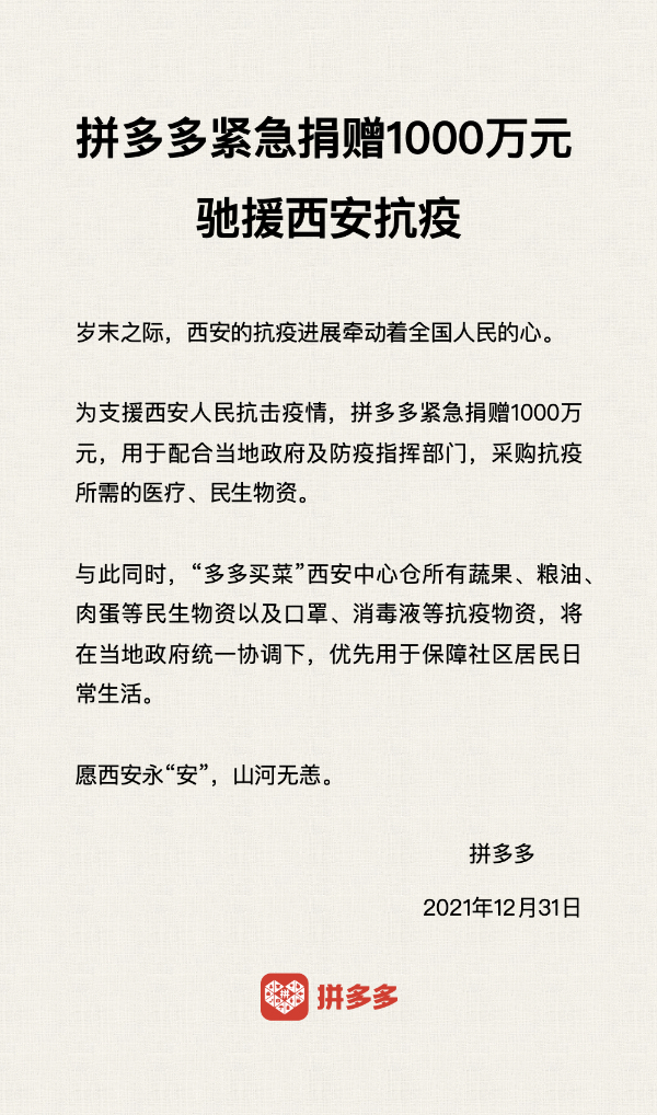為支援西安人民抗擊疫情,12月31日,拼多多宣布捐贈1000萬元,用于配合當地政府及防疫指揮部門,采購抗疫所需的醫(yī)療、民生物資。