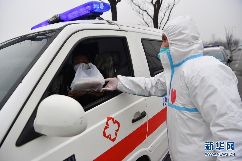 1月4日,在西安市雁塔區(qū),志愿者暢璘將食品送至一位負(fù)責(zé)運輸核酸檢測樣本的救護(hù)車駕駛員手中。新華社記者 張博文 攝