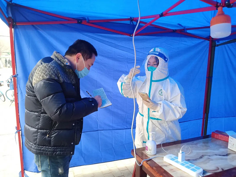 2021年12月21日,陜西日?qǐng)?bào)社記者齊卉(左)在采訪參與一線防疫的志愿者。