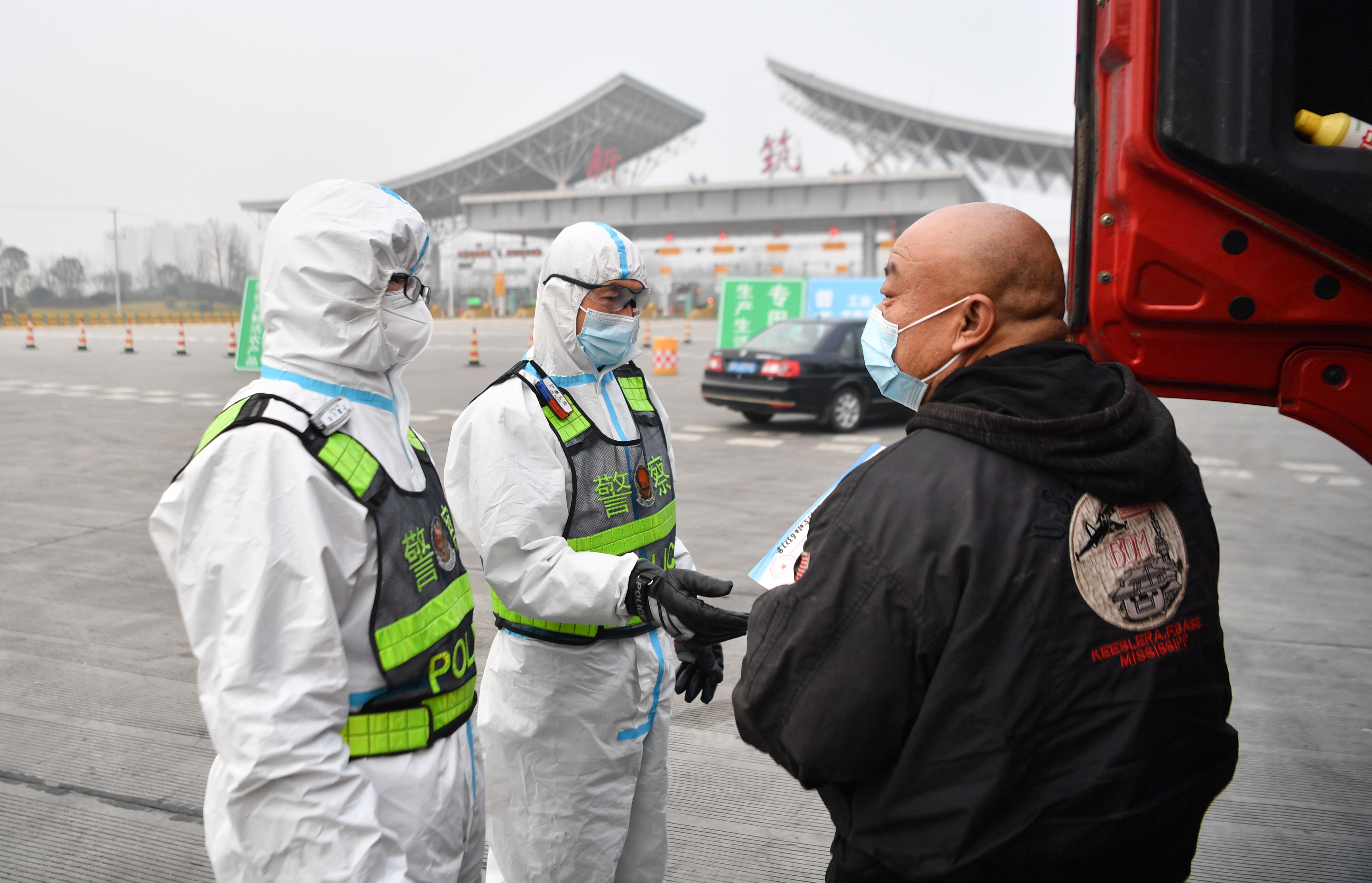 1月10日,西安市公安局浐灞生態(tài)區(qū)分局民警在西安市繞城高速新筑收費站查驗車輛通行證件。新華社記者 張博文 攝