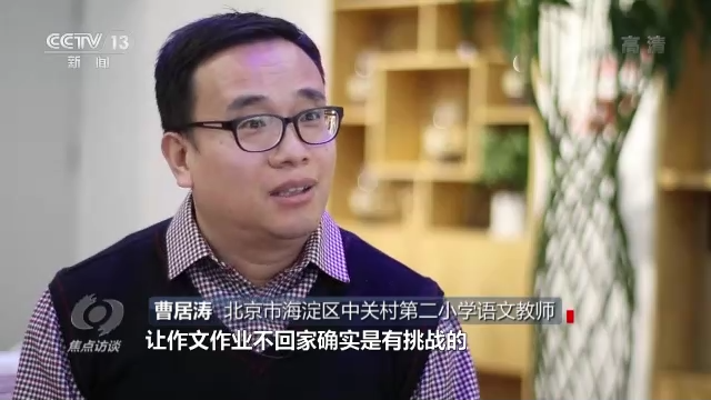 北京市海淀區(qū)中關(guān)村第二小學(xué)語文教師曹居濤說:“比如說高年級(jí)的作文,讓作文作業(yè)不回家確實(shí)是有挑戰(zhàn)的,所以我們就對(duì)教與學(xué)的方式進(jìn)行了大膽的嘗試和改變。從習(xí)作布置的時(shí)間上進(jìn)行了改變,叫任務(wù)前置。孩子學(xué)習(xí)單元之初,要了解這一單元當(dāng)中的習(xí)作主題是什么,讓孩子的習(xí)作和生活建立聯(lián)系。”