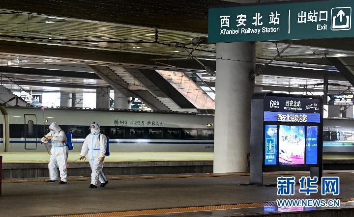 1月16日,工作人員對西安北站站臺進(jìn)行消殺。新華社記者 陶明 攝