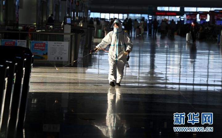 1月16日,工作人員在對西安北站候車大廳進(jìn)行環(huán)境消毒。新華社記者 陶明 攝