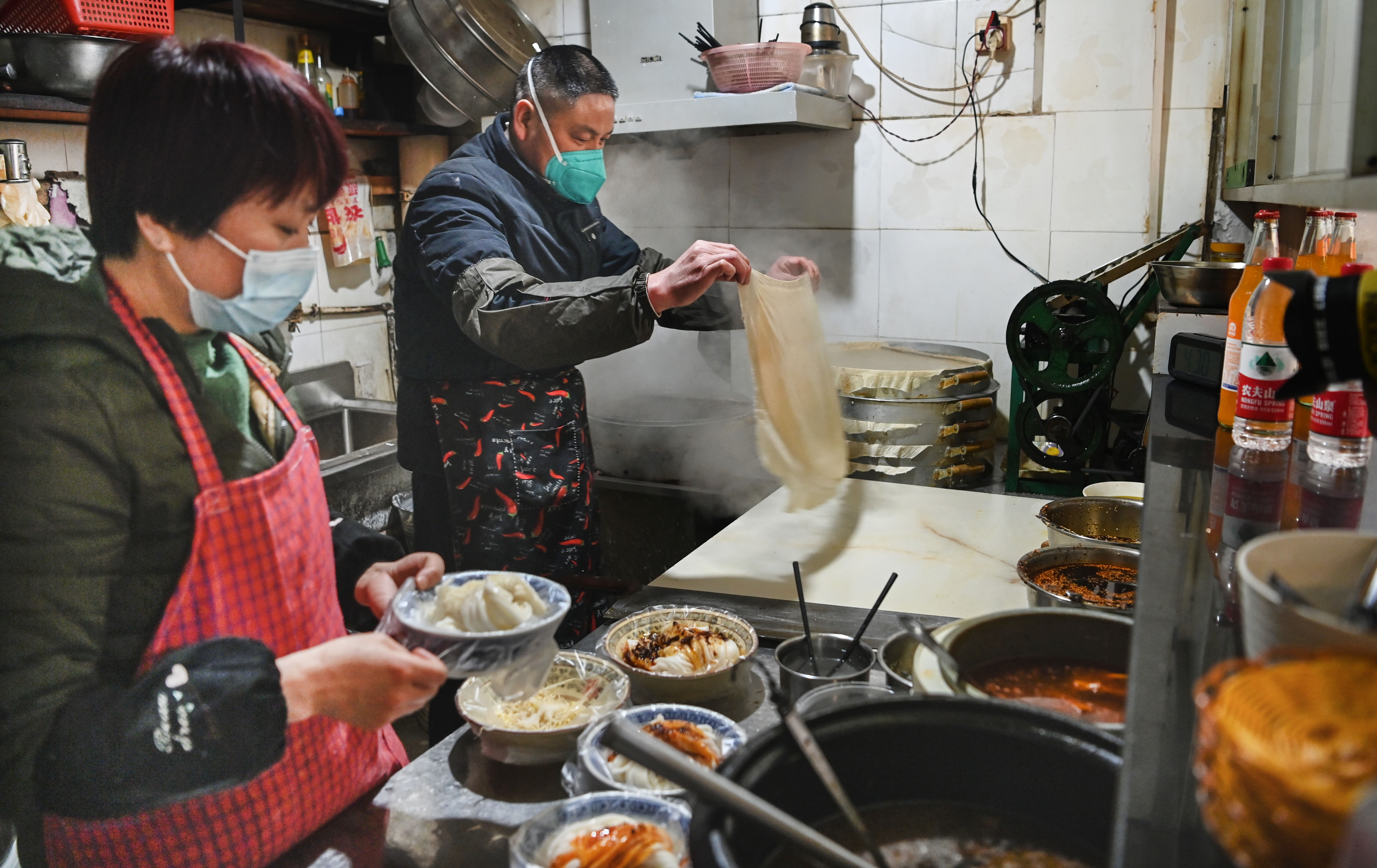 1月17日,西安市未央區(qū)一家小吃店開始營業(yè),為附近居民送餐上門。新華社記者 陶明 攝