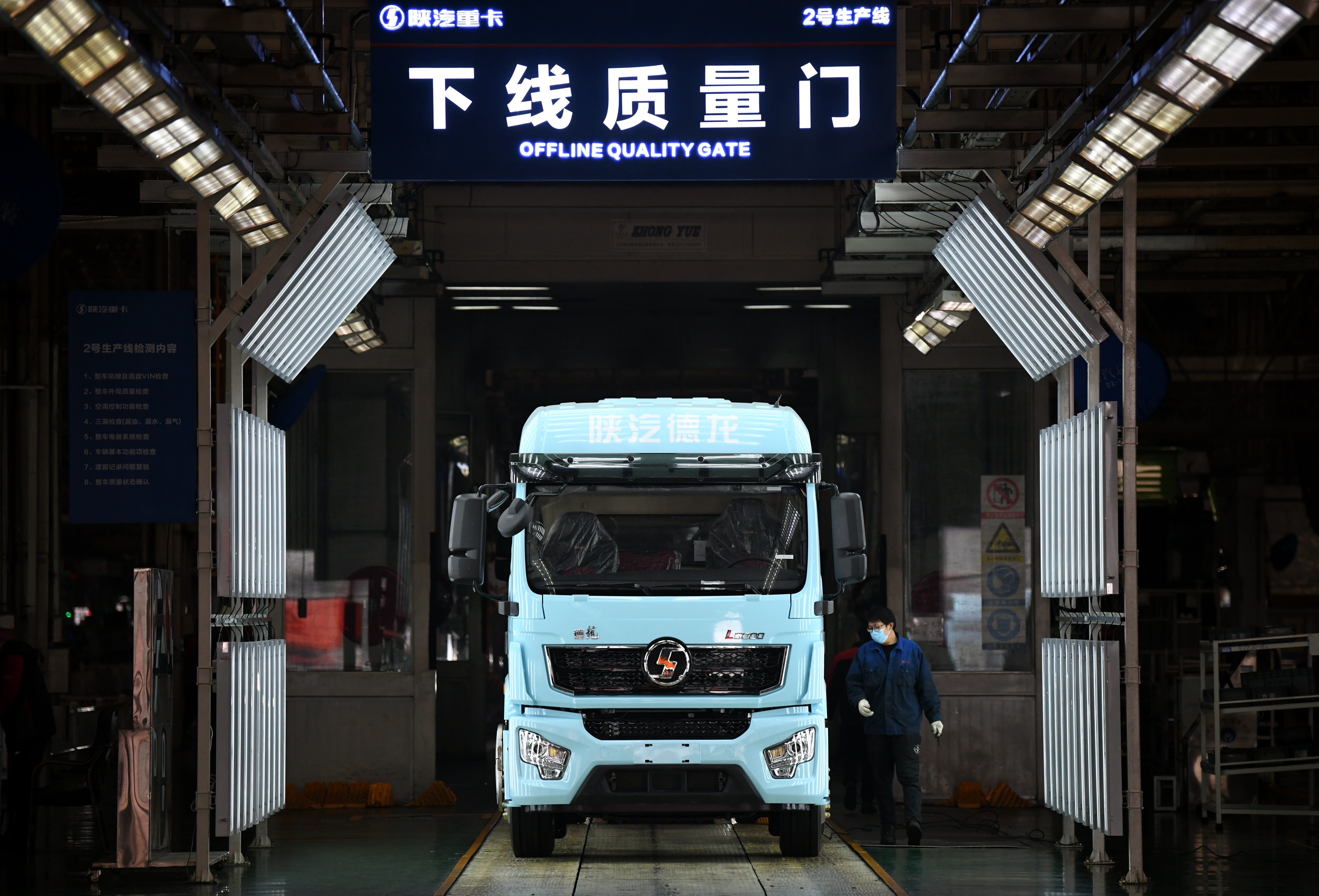 凜冬時節(jié),位于西安市經(jīng)開區(qū)的陜汽控股集團總裝配車間,機器轟鳴,兩條各475米長的傳送鏈正在緩慢推進,390余名戴著口罩、身著藍色工服的工人們正埋頭組裝汽車,平均每六分鐘就有一輛重卡從這里下線,遠銷國內(nèi)外市場。