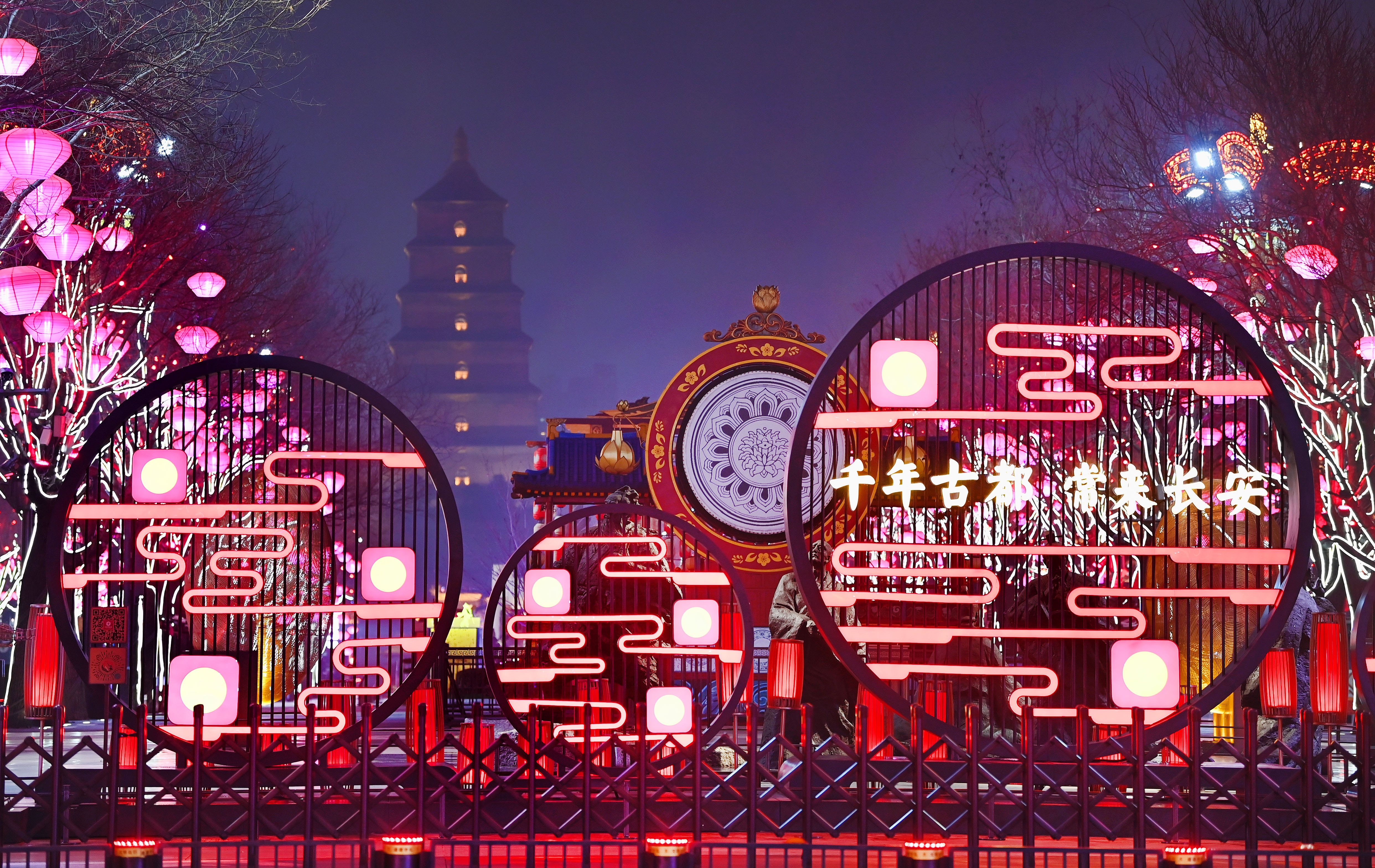 鐘鼓樓旁,西安回坊,一家肉丸胡辣湯店前,隊伍已有百米之長;古城墻邊,環(huán)城公園,凌寒怒放的蠟梅香氣陣陣,引得游客競相拍照;大雁塔下,步行街上,市民們提著大包小包剛剛購得的新年禮物,滿滿的喜悅撲面而來……