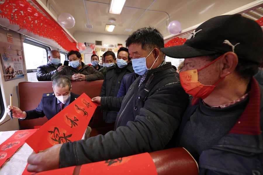 列車工作人員為旅客寫春聯(lián)(央廣網(wǎng)發(fā) 劉松霖攝)