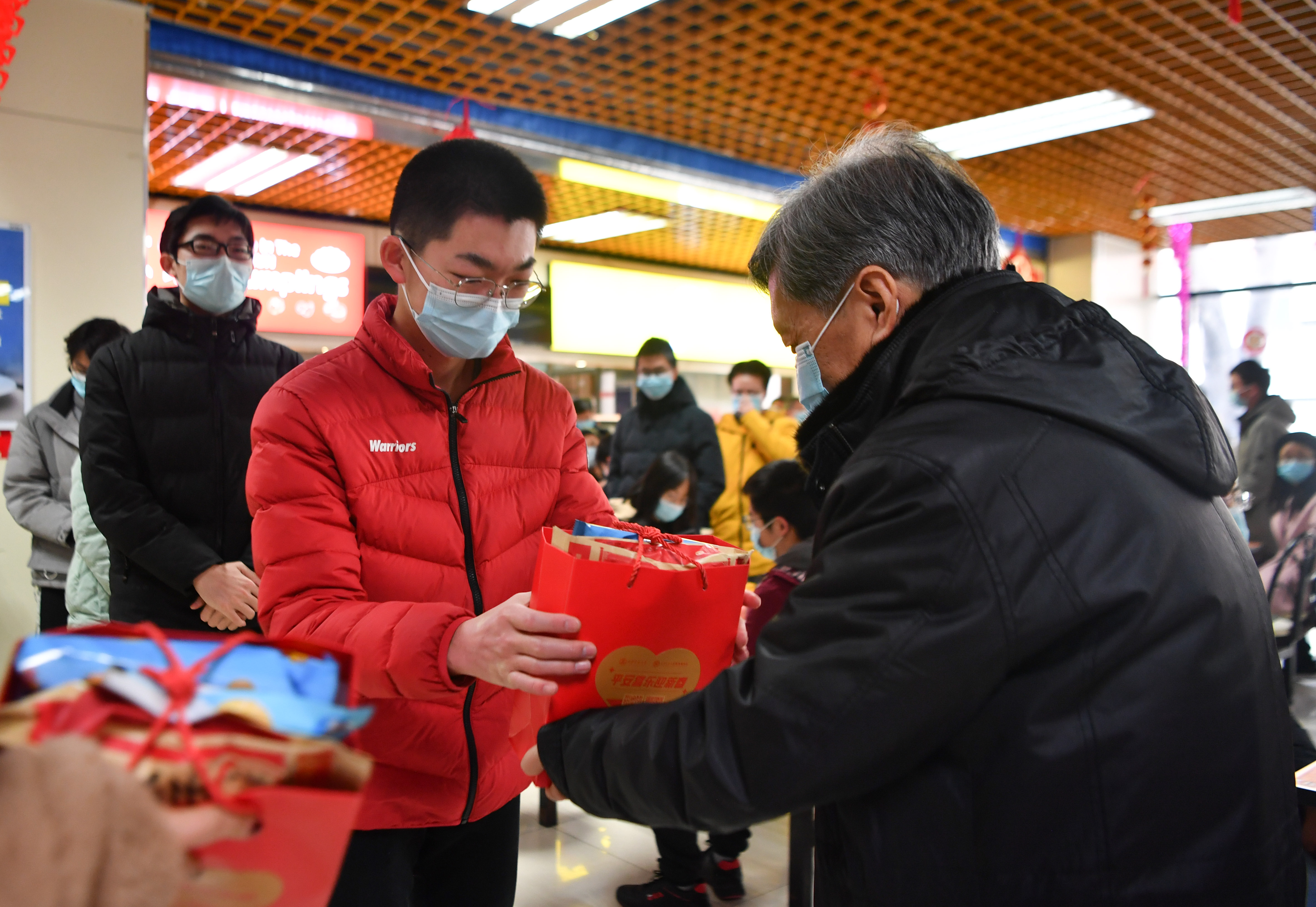 1月29日,西安交通大學留校學生排隊領取學校發(fā)放的禮包。新華社記者 張博文 攝