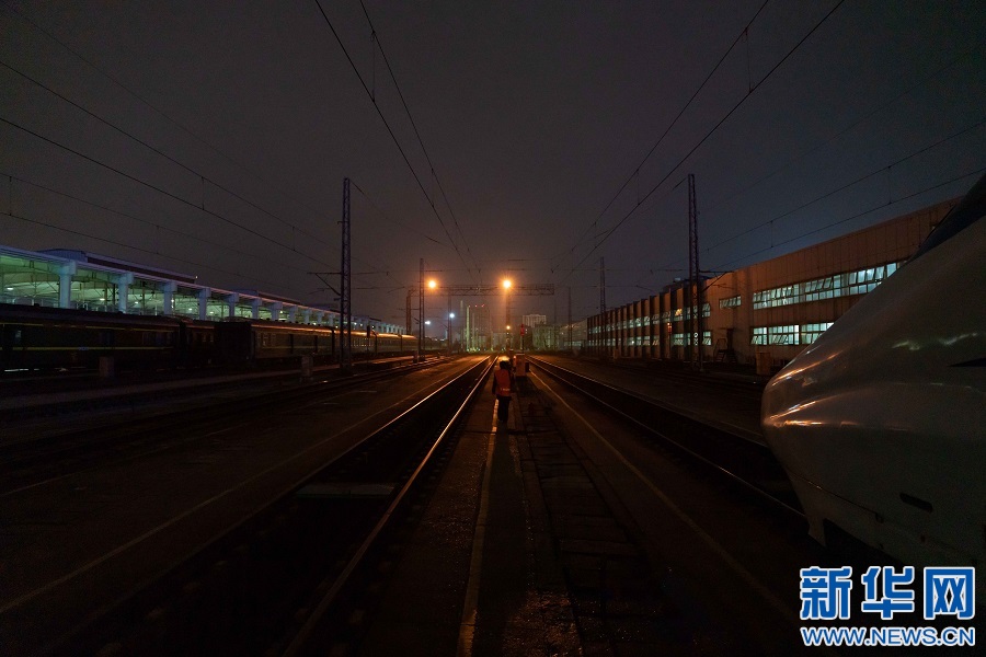 檢查完動(dòng)車組,蘇盛行走在列車停車場內(nèi)。新華網(wǎng)發(fā) 趙磊 攝