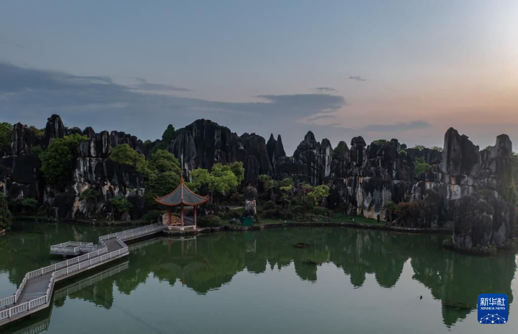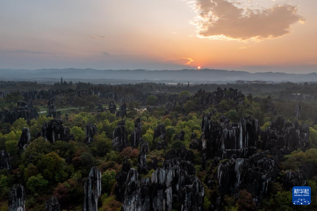 這是4月9日拍攝的石林日落景觀(無人機(jī)照片)。新華社記者 曹夢瑤 攝