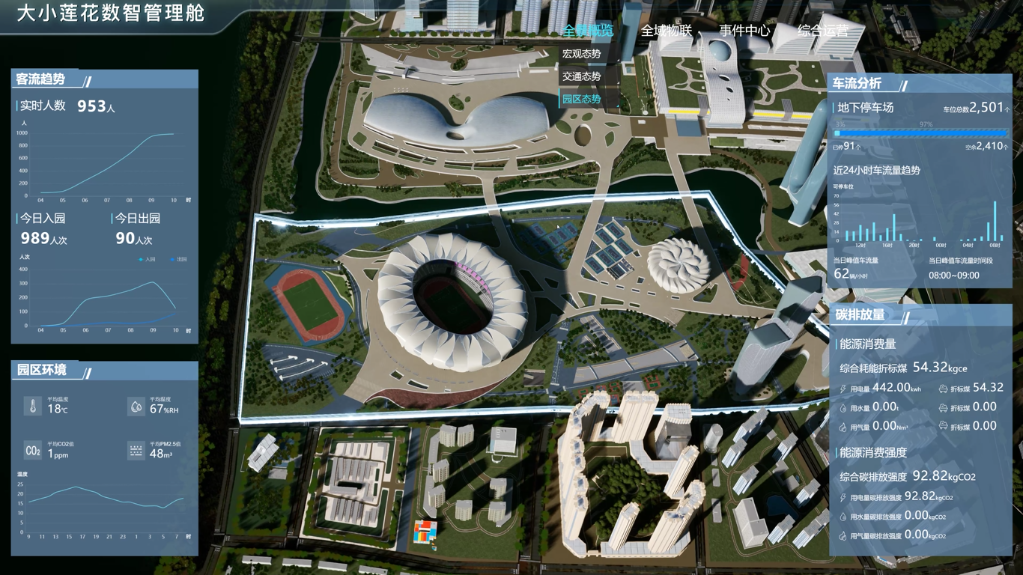據(jù)悉,數(shù)智管理艙鏈接了整個“大小蓮花”區(qū)域內(nèi)的50個弱電系統(tǒng)、2萬多個設(shè)備、8萬多個設(shè)備單元,可以實(shí)現(xiàn)對場館區(qū)域內(nèi)的水、電、氣等實(shí)時能耗的監(jiān)測,還可以統(tǒng)計二氧化碳、碳排放量等。