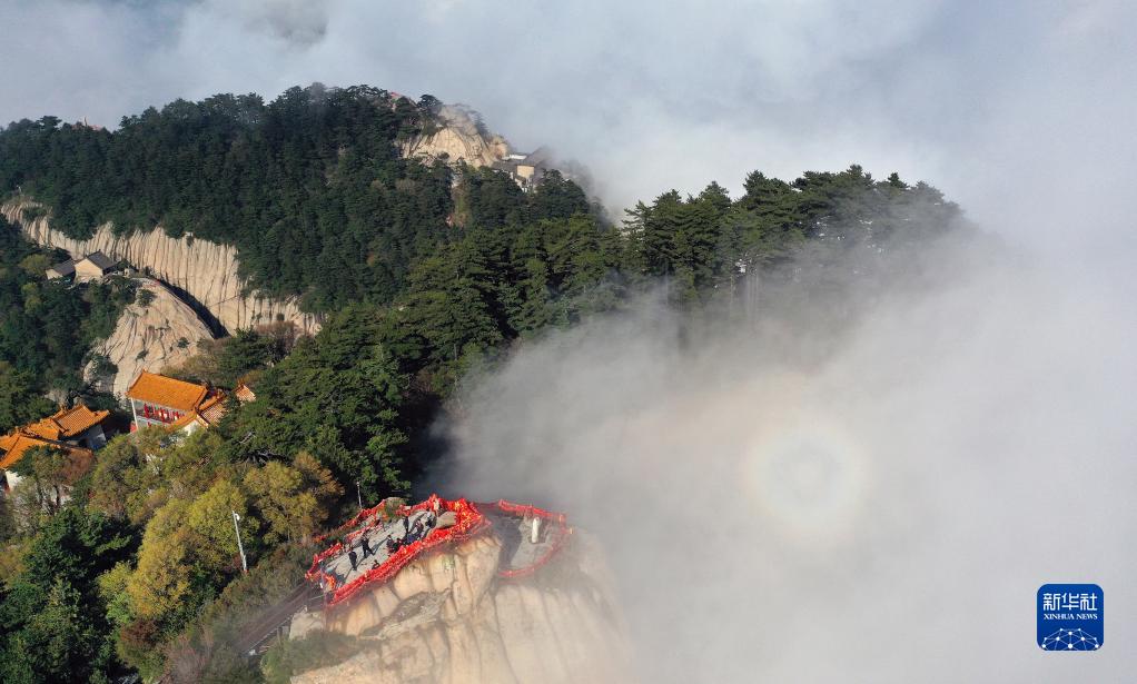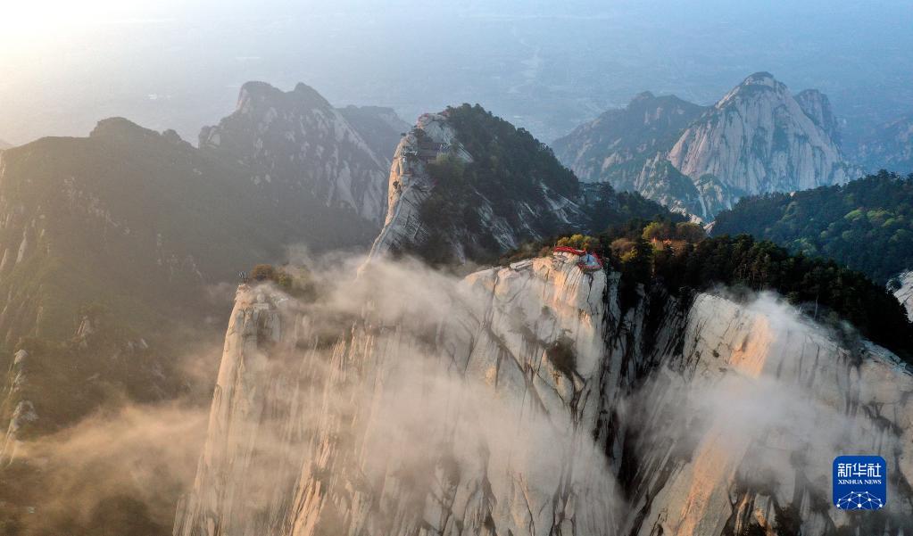 云霧中的華山西峰(4月28日攝,無人機(jī)照片)。新華社記者陶明攝