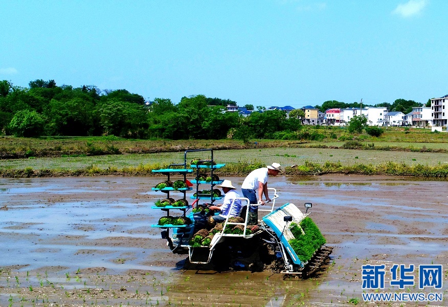在江西省湖口縣新豐村的連片稻田里,周益和父親周愛霞正駕駛農機來回穿梭。新華網(wǎng)發(fā) 徐會剛 攝