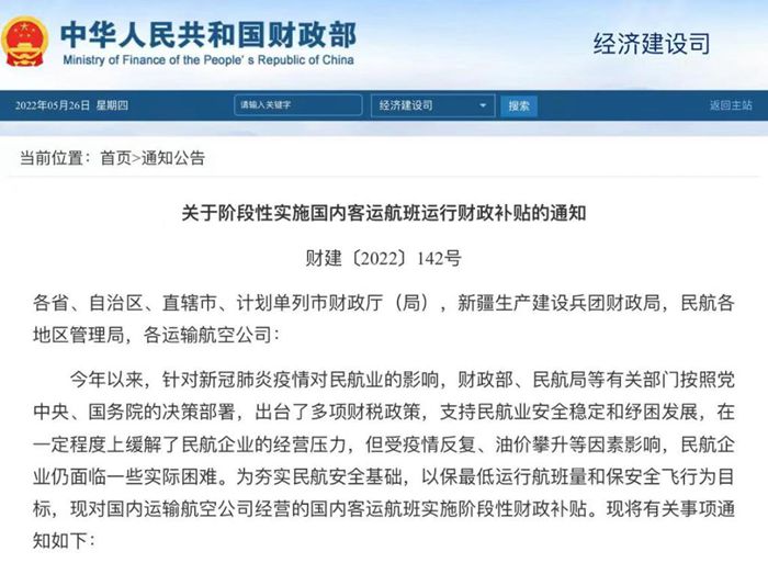 記者26日了解到,財(cái)政部、民航局日前發(fā)布通知,自2022年5月21日至2022年7月20日,對(duì)國內(nèi)運(yùn)輸航空公司經(jīng)營的國內(nèi)客運(yùn)航班實(shí)施階段性財(cái)政補(bǔ)貼。原則上當(dāng)每周內(nèi)日均國內(nèi)客運(yùn)航班量低于或等于4500班(保持安全運(yùn)行最低飛行航班數(shù))時(shí),啟動(dòng)財(cái)政補(bǔ)貼。對(duì)國內(nèi)客運(yùn)航班實(shí)際收入扣減變動(dòng)成本后的虧損額給予補(bǔ)貼。設(shè)定最高虧損額補(bǔ)貼標(biāo)準(zhǔn)上限為每小時(shí)2.4萬元。(記者申鋮、周圓)