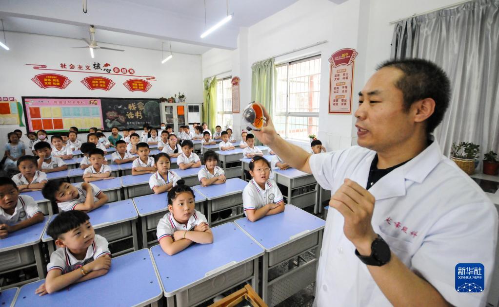 6月5日,在重慶市北碚區(qū)一家眼科醫(yī)院,一名驗光師在給孩子們講解眼球構(gòu)造知識。新華社發(fā)(秦廷富 攝)
