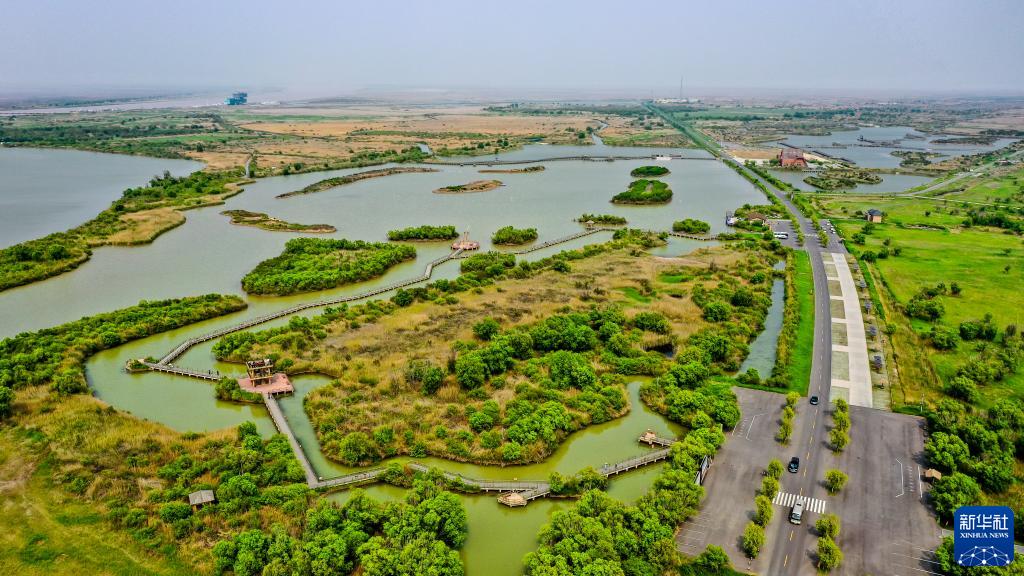 夏日的東營市黃河入??跐竦?,綠草連天、百鳥翔集。