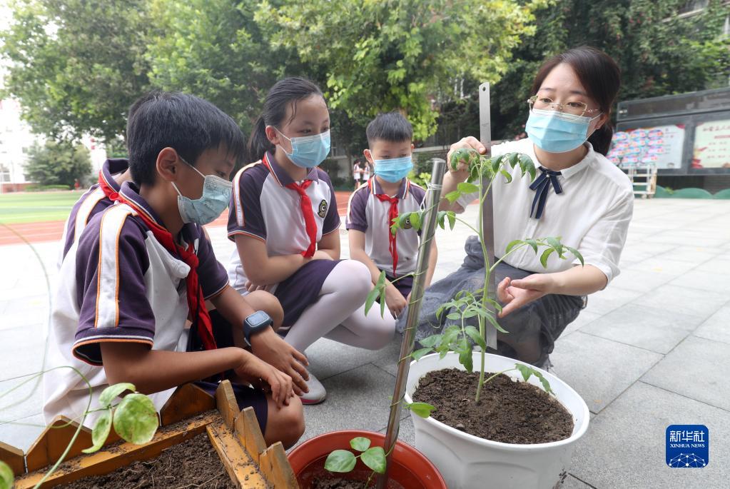 8月3日,在河北省石家莊市長安東路小學(xué),老師(右一)為學(xué)生們測量太空種子植株。新華社發(fā)(梁子棟攝)