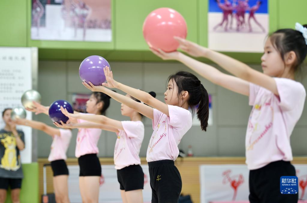 8月3日,在河北省石家莊市裕華區(qū)的一家體育訓(xùn)練館,學(xué)習(xí)藝術(shù)體操的孩子們在刻苦訓(xùn)練。新華社發(fā)(張曉峰攝)