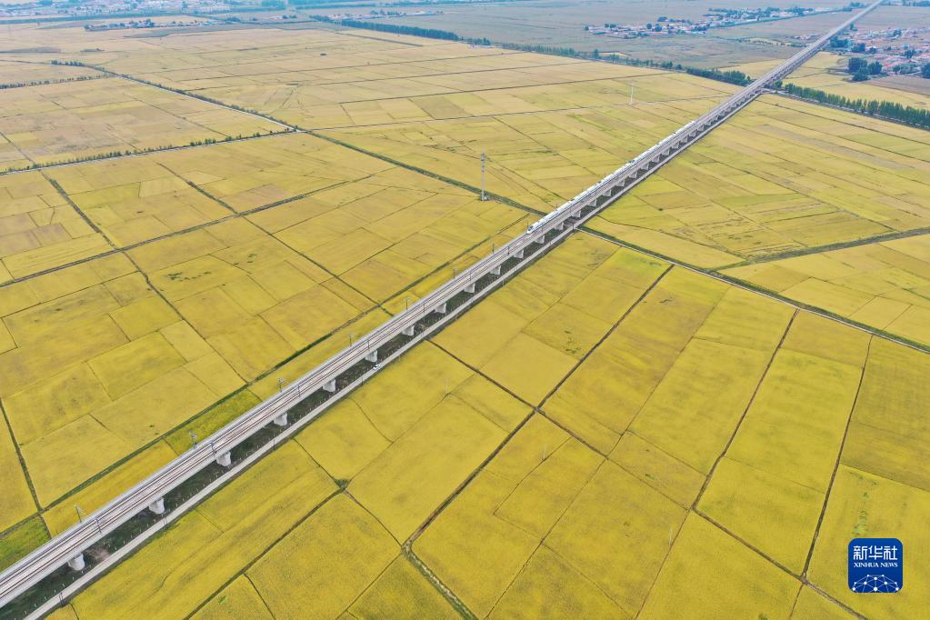 高鐵列車從吉林省公主嶺市沃野間駛過(2021年9月19日攝,無人機(jī)照片)。新華社記者 張楠 攝