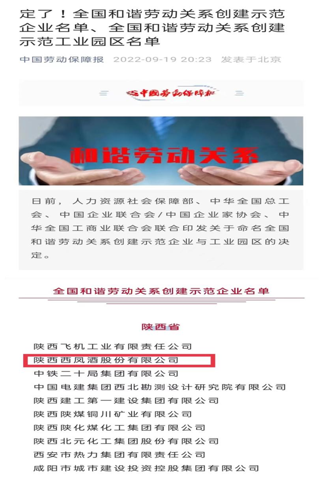 西部決策網(wǎng)訊(記者艾米杰 韓宗憲 通訊員 許凡 張?zhí)炝ⅲ闃淞⑹痉兜湫?、弘揚(yáng)人文關(guān)懷、傳遞和諧溫暖,進(jìn)一步推動(dòng)廣大企業(yè)深入開展和諧勞動(dòng)關(guān)系創(chuàng)建活動(dòng),促進(jìn)構(gòu)建中國特色和諧勞動(dòng)關(guān)系。近日,人力資源和社會(huì)保障部、中華全國總工會(huì)、中國企業(yè)聯(lián)合會(huì)/中國企業(yè)家協(xié)會(huì)、中華全國工商業(yè)聯(lián)合會(huì)聯(lián)合印發(fā)《關(guān)于命名全國和諧勞動(dòng)關(guān)系創(chuàng)建示范企業(yè)與工業(yè)園區(qū)的決定》,陜西西鳳酒股份有限公司榜上有名,榮獲“全國和諧勞動(dòng)關(guān)系創(chuàng)建示范企業(yè)”稱號。