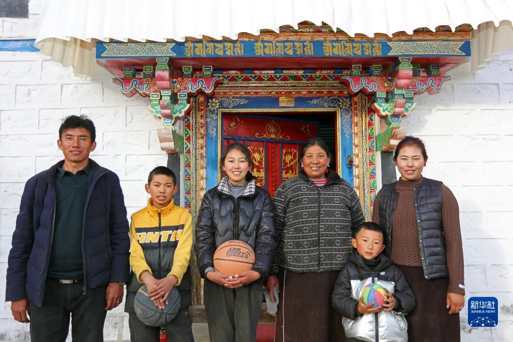 林芝市嘎拉村村民達瓦堅參(左一)一家在家門口合影(2022年2月23日攝)。新華社記者 姜帆 攝