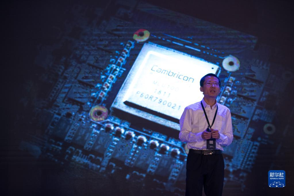 在上海國際會議中心舉行的發(fā)布會上,寒武紀科技公司首席執(zhí)行官陳天石介紹國內(nèi)首款云端人工智能芯片(2018年5月3日攝)。新華社記者 金立旺 攝