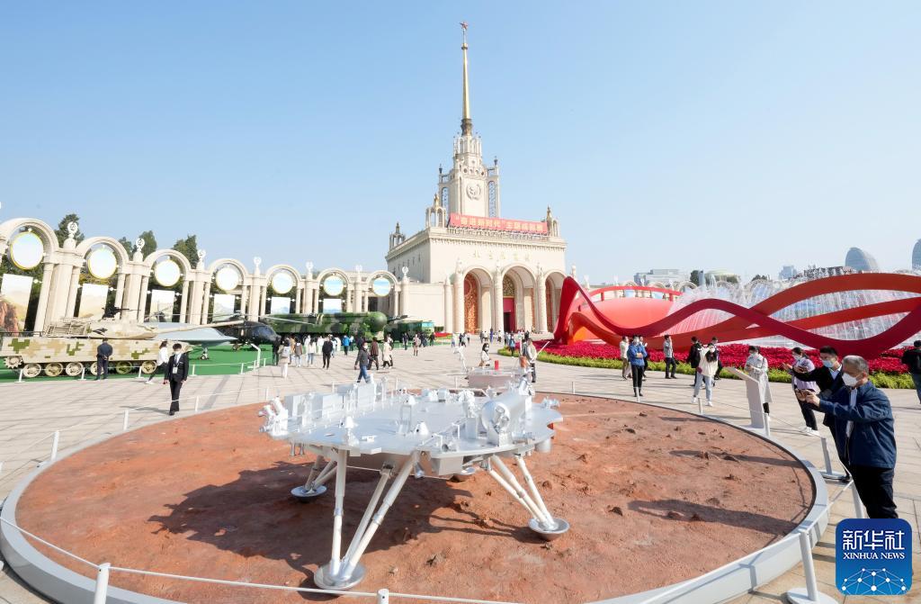 10月7日,觀眾在“奮進(jìn)新時(shí)代”主題成就展上參觀天問(wèn)一號(hào)著陸器模型。當(dāng)日是國(guó)慶長(zhǎng)假的最后一天,大批觀眾來(lái)到北京展覽館參觀“奮進(jìn)新時(shí)代”主題成就展。新華社記者王毓國(guó) 攝